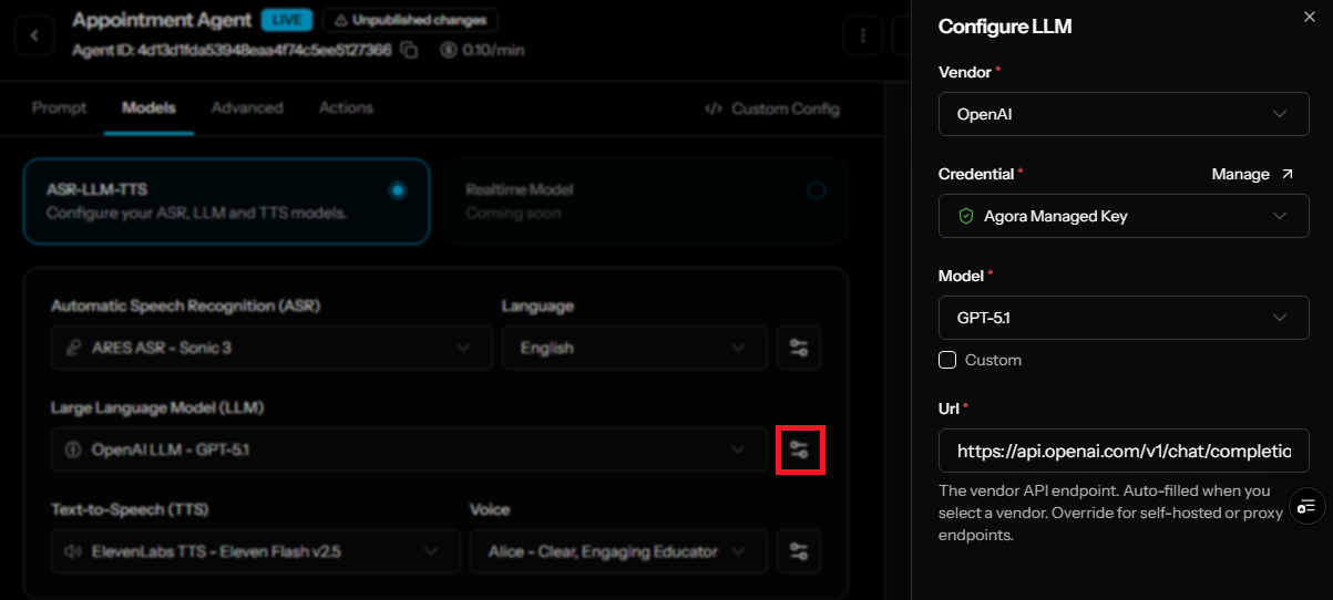 To use your own API key or to select a vendor or model not available under Agora Managed Key, click the settings icon next to the relevant dropdown. This opens a configuration panel where you can select any supported vendor and add your own API credentials. See Manage integrations for details on adding credentials.